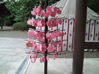 正門には金色の五輪の桜花(おうか)、布にも提灯にも桜花、なんと絵馬もピンク色の桜花の形で、さらには駐車場のカラーコーンも桜花、である! 見事なまでに桜花づくし、なのだ。